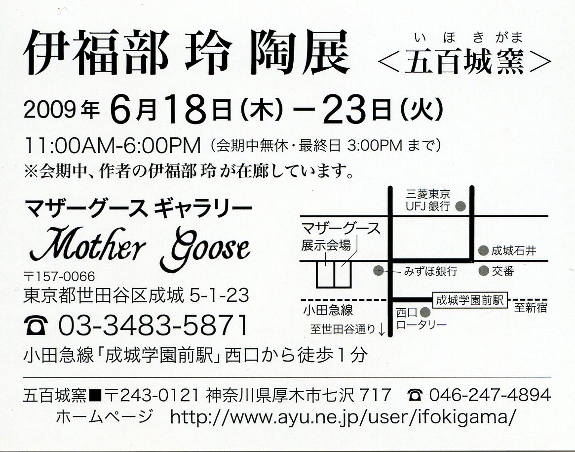 伊福部 玲 陶展 伊福部 玲 陶展五百城窯(いほきがま)2009 年 6 月 18 日(木)~ 6 月 23 日(火)11: 00 ~ 18: 00(最終日 15: 00 終了)定休日:会期中無休マザーグース東京都世田谷区成城5-1-2303 - 3483 - 5871 ※ 七沢工房の陶芸教室はコロナ禍の影響により現在休止させて頂いております。再開時期は未定なのでお答えできませんがその他お問い合せがありましたら連絡先のページをご覧ください。 コメント