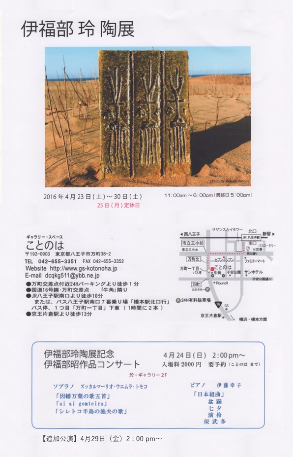 伊福部玲 陶展 2016年4月23日(土)からの「伊福部玲 個展」におけるギャラリーコンサートについて、4月29日(金)に追加公演を行うことが決まりましたのでお知らせいたします。 個展開催期間:2016年4月23日(土)〜 同 30日(土) ギャラリーコンサート:4月24日(日) 午後2時から(入場料2,000円、要予約) 追加コンサート:4月29日(金)午後2時から(同上) ※ 七沢工房の陶芸教室はコロナ禍の影響により現在休止させて頂いております。再開時期は未定なのでお答えできませんがその他お問い合せがありましたら連絡先のページをご覧ください。 コメント