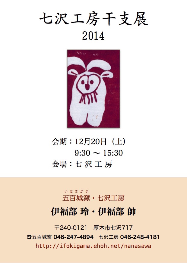 干支展のお知らせ(於:七沢工房) 2014年12月20日に七沢工房にて干支展を催しますのでお報せいたします。 【クリックで拡大】 会期:2014年12月20日(土) 時間:9:30 〜 15:30 会場:七沢工房 ※ 七沢工房の陶芸教室はコロナ禍の影響により現在休止させて頂いております。再開時期は未定なのでお答えできませんがその他お問い合せがありましたら連絡先のページをご覧ください。 コメント