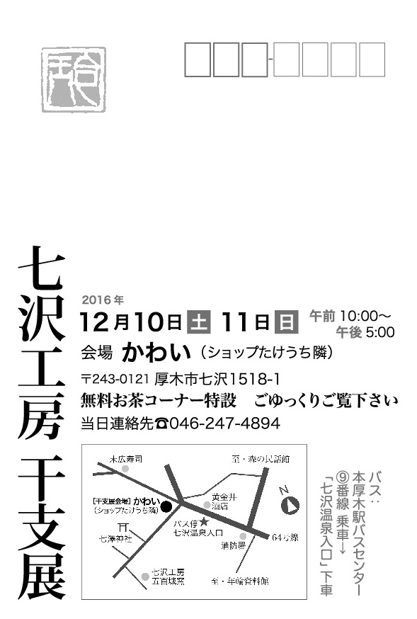 干支展のお知らせ(2016、於:かわい) 2016年12月10日(土)〜11日(日)に "かわい" にて七沢工房干支展を催しますのでお知らせいたします。 会期:2016年12月10日(土)〜11日(日) 時間:午前10時〜午後5時 会場:かわい(厚木市七沢1517-1、ショップたけうち隣) 当日連絡先:046-247-4894(おかけ間違いのないようご注意ください) 無料お茶コーナー特設、ごゆっくりご覧ください。 皆様のご来場、お待ちしております。 以下のリンクをクリック、または二次元バーコードを読み込むことで会場近辺の地図をGoogle Mapで表示できます。 [クリック]Google Mapで表示する [読み取る] ※ 七沢工房の陶芸教室はコロナ禍の影響により現在休止させて頂いております。再開時期は未定なのでお答えできませんがその他お問い合せがありましたら連絡先のページをご覧ください。 コメント