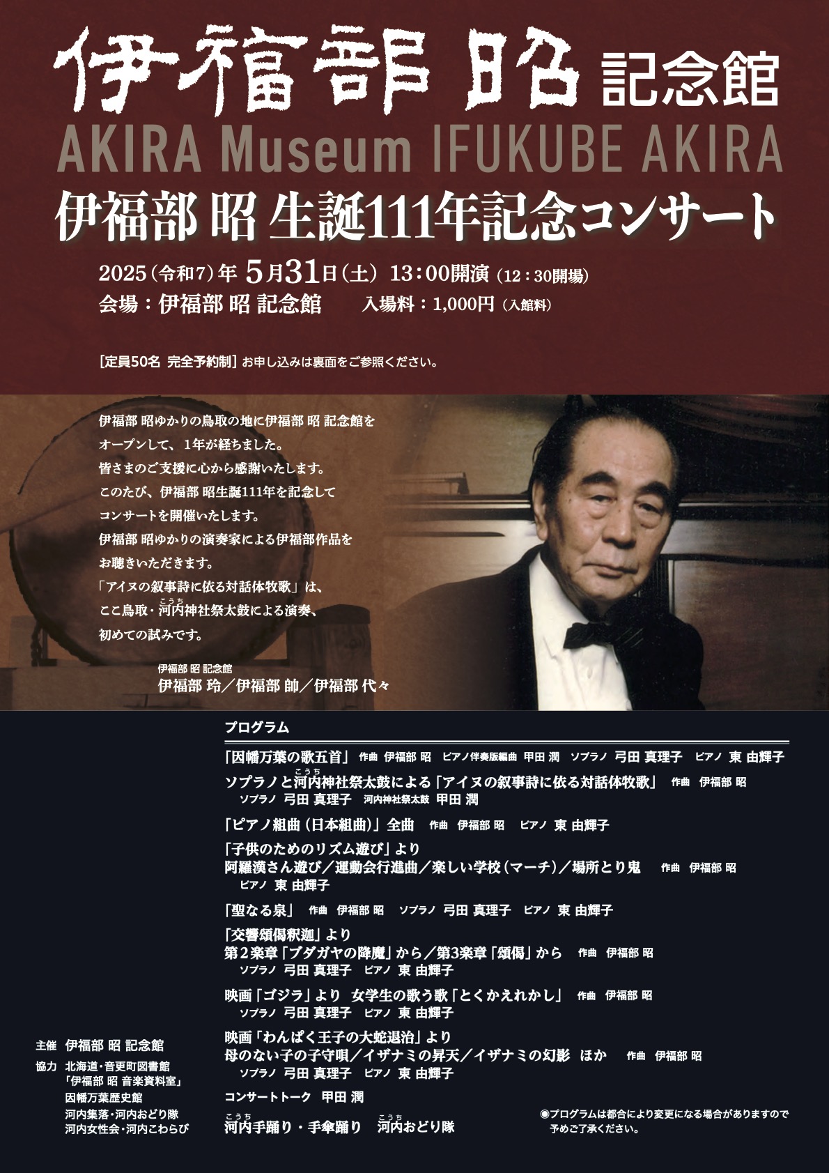 2025年5月31日、伊福部昭記念館において「伊福部昭生誕111年記念コンサート」を開催いたします。演目、演奏者等は上記パンフレットをご参照ください(クリックで拡大します)