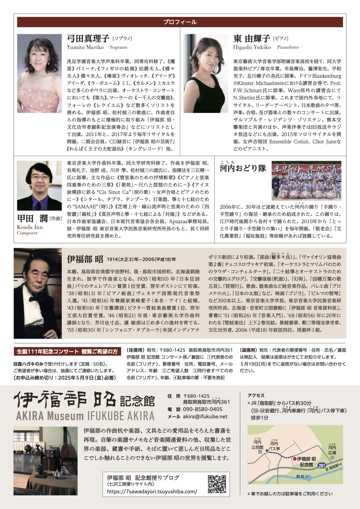 - 宛先:〒680-1425 鳥取県鳥取市河内361 伊福部昭記念館 コンサート係