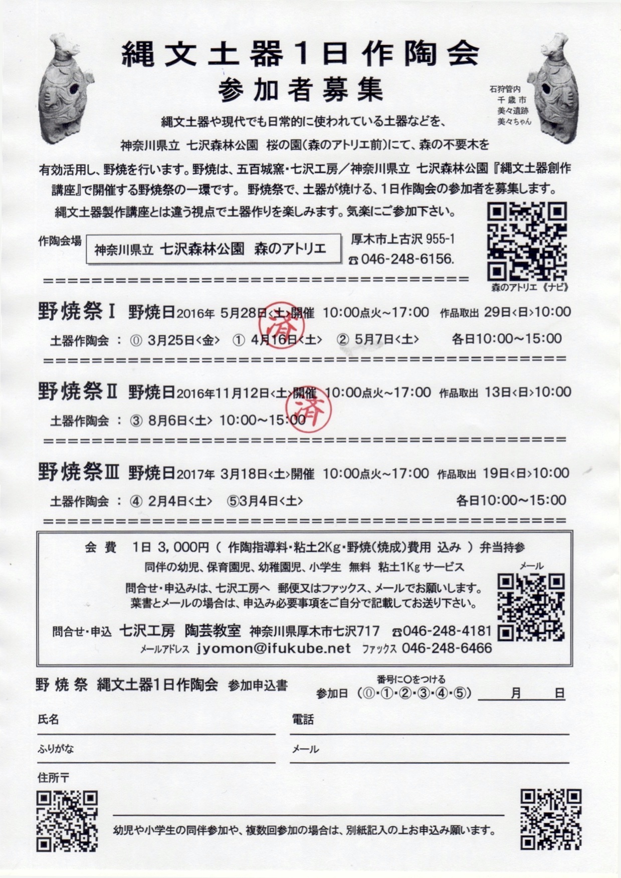 第11期・縄文土器創作講座(A4版、約238KB)お申し込みはプリントアウトした上記ファイルに必要事項を記入し、ファクシミリまたは郵送にてお送りください。