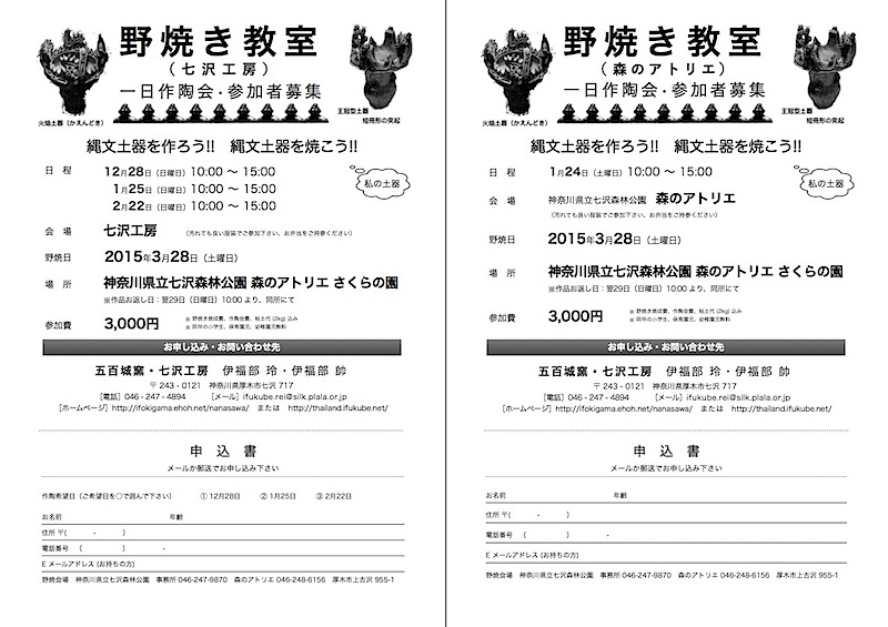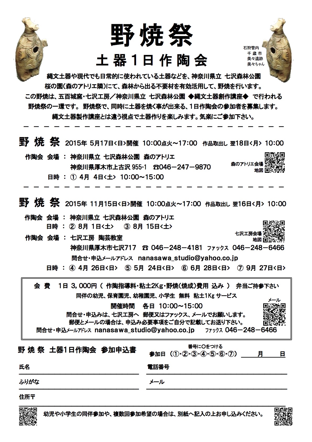野焼祭(土器1日作陶会)案内兼お申し込み用紙(A4版、約153KB)※ 七沢工房の陶芸教室はコロナ禍の影響により現在休止させて頂いております。再開時期は未定なのでお答えできませんがその他お問い合せがありましたら連絡先のページをご覧ください。