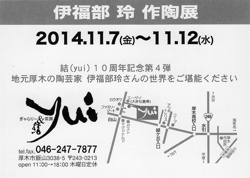 2014年11月7日(金)から11月12日(水)までの六日間、ぎゃらりー&茶房 "結" にて個展を行いますのでお報せ致します。