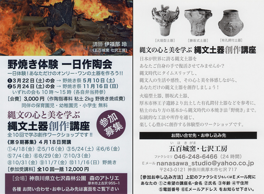 野焼き体験一日作陶会・縄文土器創作講座 お申し込み用紙(PDF)※ 七沢工房の陶芸教室はコロナ禍の影響により現在休止させて頂いております。再開時期は未定なのでお答えできませんがその他お問い合せがありましたら連絡先のページをご覧ください。