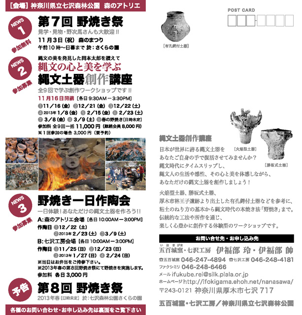 七沢森林公園さくらの園にて、2013 年春(日時未定)に開催予定。上記作陶会で制作して頂いた作品はこの場で野焼きを実施します。