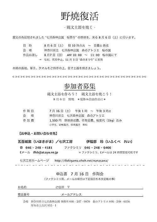 参加ご希望の方は以下のリンクより書類をプリントアウトし、ファクシミリまたは郵送にてお申し込み下さい。郵送先は七沢工房宛、住所は "連絡先" のページにてご確認頂けます。